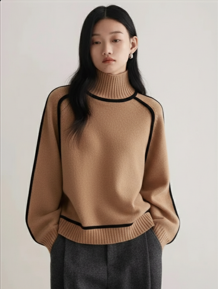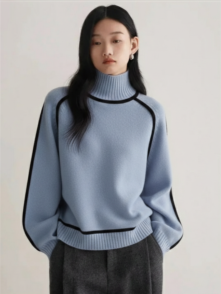 Crafted from a premium soft blend, this turtleneck sweater combines warmth with a clean, structured silhouette. Bold contrast seam detailing adds a modern edge while the relaxed shape keeps the look effortless and refined. Ribbed finishes and a smooth drape make it an elevated essential for both polished and casual styling.